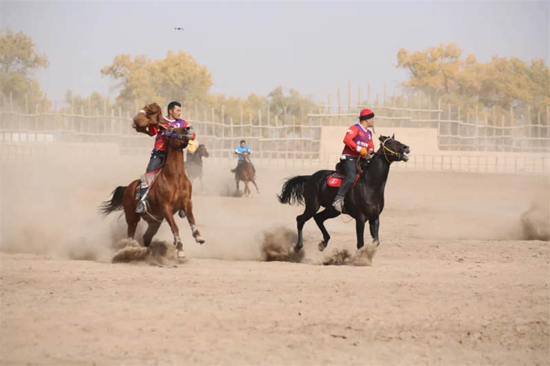 旅游季期间,巴楚县326万亩原始野生胡杨林构成的金色画卷,成为各项特色活动的天然背景。在“古道骁勇 赛场英姿”民间传统体育竞技展演中,叼羊赛马的激烈角逐、且力西的力量对抗,尽显民俗豪情;“沪厨传艺 巴味飘香”美食展上,上海风味与巴楚烤骆驼、烤包子等特色美食跨越地区碰撞交融,“丝路第一馕坑”的烟火升腾与“沪疆协作”的温暖情谊,共同绘就舌尖上的文化交融画卷;“击水金秋 舟行碧波”龙舟大赛上,选手们劈波斩浪,与岸边观众的加油喝彩声相映成趣,为秋日红海增添了蓬勃活力。