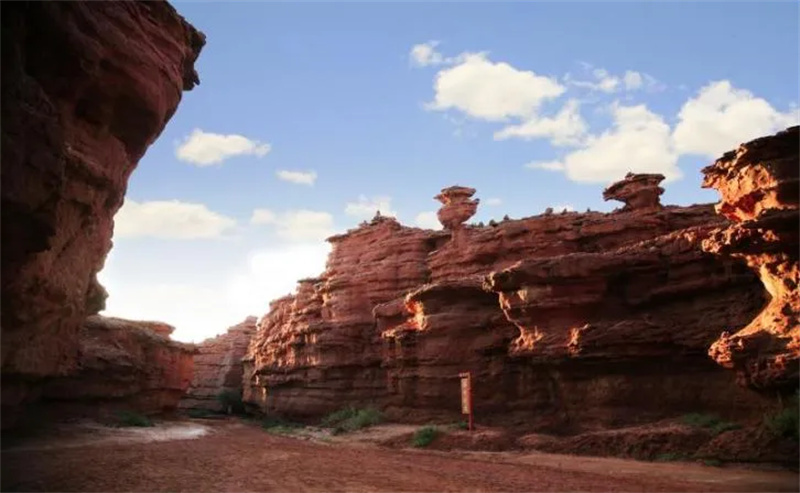 旅游区全长5公里,藏于“七彩神山”阴山,红黄沙石经万年雕琢显沧桑。夕阳下山体流光溢彩,以红、黄等多色展现神奇壮美。