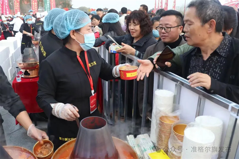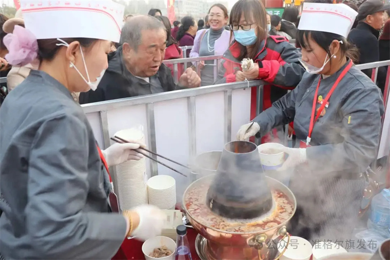 作为本次嘉年华的重头戏,“热辣滚烫万人火锅宴”在傍晚时分飘香开启。以准格尔本地鲜香羊肉为主打食材,9家本地知名火锅品牌联袂献味。现场热气蒸腾、香气四溢,市民们有序排队领取品鉴套餐,手捧热汤,口尝鲜香,在渐凉的秋夜中感受着“万人同锅”的温暖与团圆。“这样的活动太有氛围了!”带着孩子前来参加的李莲女士兴奋地说,“不仅吃到了地道的准格尔本地鲜香羊肉,更让我们感受到了浓浓的节日人情味,孩子说这是最美味的秋天!”