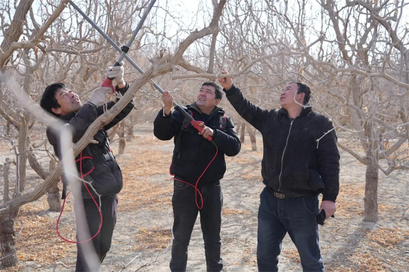 1月16日,若羌县吾塔木乡依格孜吾斯塘村村民芒力克·艾合买提(中)和伙伴们一起在修剪枣树。苏波 摄