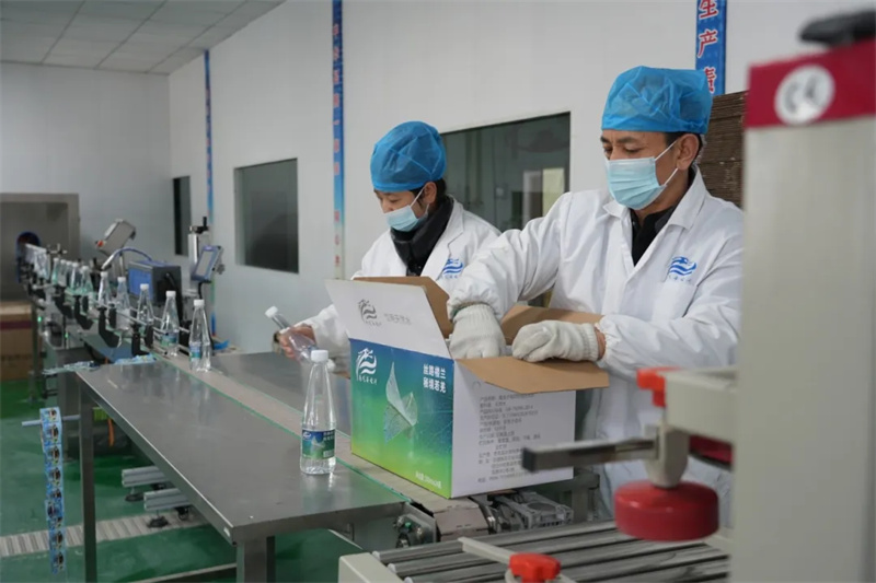 当天,若羌县冰泉纯净水有限公司的生产线正在运转,几名本地员工熟练地将瓶装水装箱。