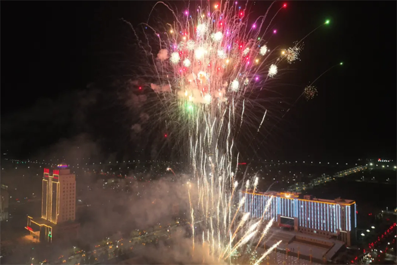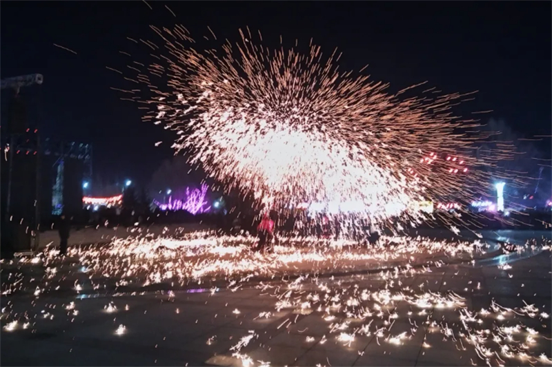 夜间特色展演将活动推向极致。熊熊篝火点燃,各族群众携手起舞,安代舞的欢快节奏中,欢声笑语汇成欢乐海洋;非遗火艺盛演惊艳亮相,火舞翩跹、打铁花流光溢彩,磅礴气势带来震撼视觉体验;压轴登场的马年主题大型烟花秀惊艳启幕,四篇章特效烟花次第绽放,绚烂光影点亮北疆夜空,为整场元宵活动画上圆满句号。