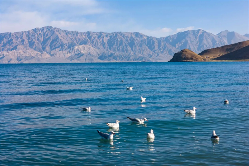 走下车,迎面吹来的风带着湿润的气息。湖面狭长如一条玉带,向远处延伸,三分之二在中国境内,三分之一流入克什米尔地区。湖水清澈见底,能看见成群的裂腹鱼在水中游弋。