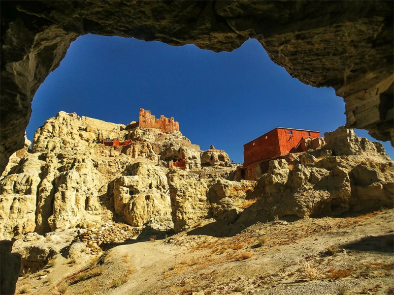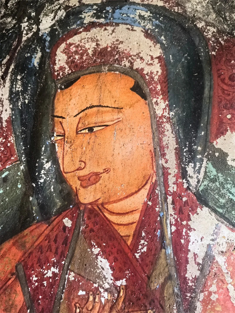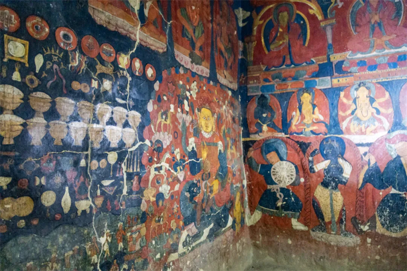 站在石窟里,你可以看见那些穿越千年的壁画。天女衣袂飘飘,曼妙的舞姿凝固在时光里。这些壁画融合了克什米尔和印度的艺术风格,吸收了中亚文化精髓,见证了古格王朝曾经的繁盛。那些朱红的颜料来自喜马拉雅深处的矿石,那些群青来自遥远的阿富汗,那些金箔曾被古格的匠人一笔一笔贴上去,已经斑驳,却依然闪着微光。