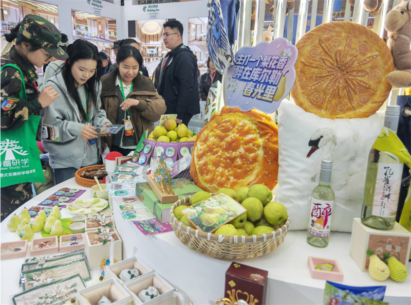 展会现场,“丝路山水 壮美巴州”主题展馆内,库尔勒展区整体设计雅致精巧、主题鲜明,涵盖梨花主题文创、香梨系列衍生产品、非遗手工艺品、特色农旅好物四大品类,每一件产品都承载着库尔勒的文化印记,成为展现梨城文旅魅力的重要载体。其中,造型灵动的香梨摆件、印有梨花纹样的春日纪念周边、兼具实用性与观赏性的梨花主题文创礼盒,既保留了库尔勒的本土特色,又融入了现代设计理念,颜值与文化内涵兼备,一经亮相便圈粉无数,成为展会“爆款”产品,多次出现供不应求的火爆场景,不少游客驻足挑选、争相购买,只为带走一份来自梨城的春日记忆。非遗手工艺品展区同样人气爆棚,剪纸、刺绣等非遗技艺现场展示,让游客在触摸传统技艺的同时,深度感受库尔勒深厚的文化底蕴;特色农旅好物则凭借天然品质,成为游客咨询选购的重点。