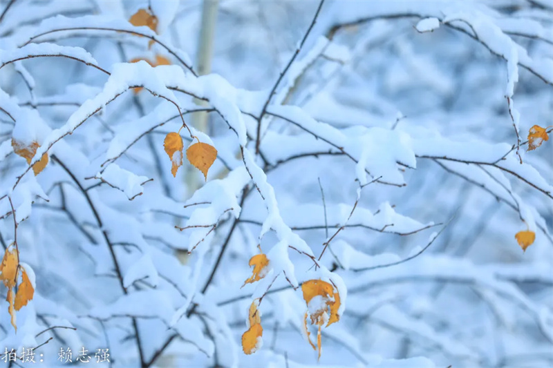 可谁能想到,一夜之间,风雪悄然而至。它就像一位神奇的魔法师,转眼给枝叶缀上了一层晶莹剔透的“糖霜”。原本金黄灿烂的枝叶,此刻被白雪包裹着,像是穿上了一件洁白的纱衣,美得让人窒息。那树枝在白雪的重压下微微弯曲,却又透着一股坚韧的力量,仿佛在向人们展示着生命的顽强与不屈。