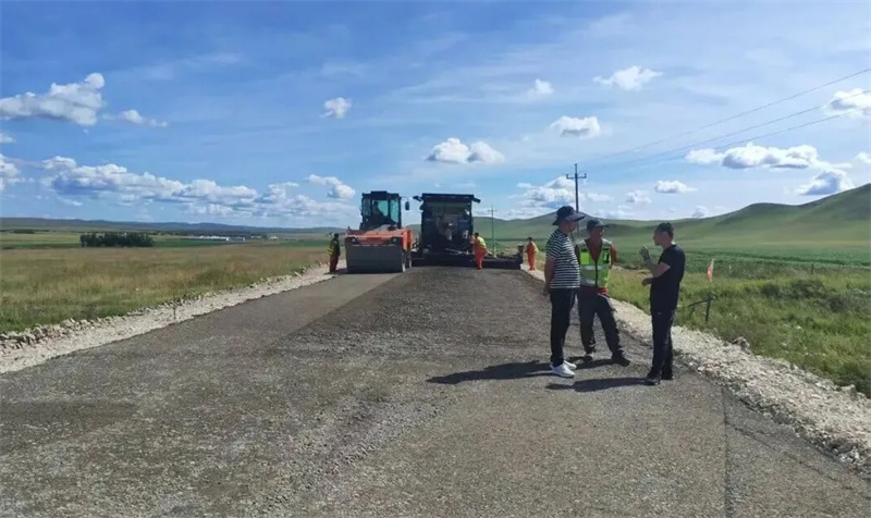 在乌拉盖管理区Y171线斯仁音昭至黑土岗段公路建设现场,压路机正在新铺的沥青路面上来回作业,一条宽阔平整的公路已初具雏形。该建设路段作为乌拉盖管理区北出口道路之一,全长7.951公里,是衔接乌拉盖管理区至阿尔山市的重要交通道路。