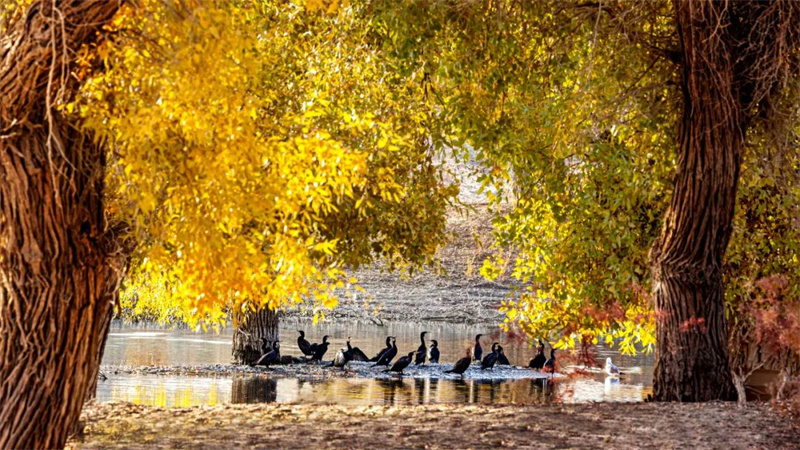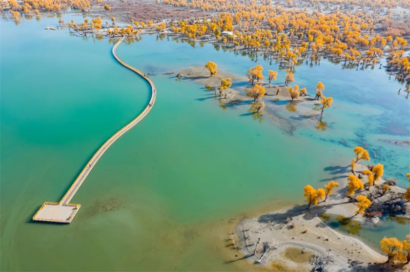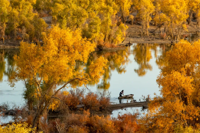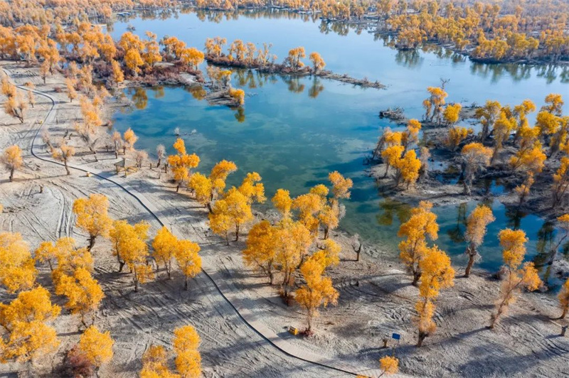 据沙雅县林草局胡杨林管理站资料显示,目前沙雅胡杨林有将近40%叶片已变黄,即将进入较佳观赏期。