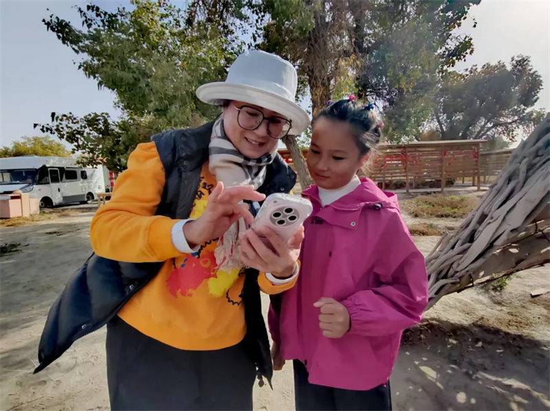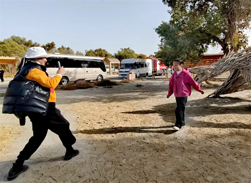 来自厦门的摄影师马义霞正在胡杨林中为当地9岁的依丽米努尔.买买提拍照。“这里的胡杨与浓郁的民俗风情相得益彰,为摄影创作提供了丰富素材。这不仅是自然风光,更是生动的文化景观。”马义霞说,依丽米努尔主动找她帮忙拍照,成了她自驾游新疆以来结交的最小的朋友。