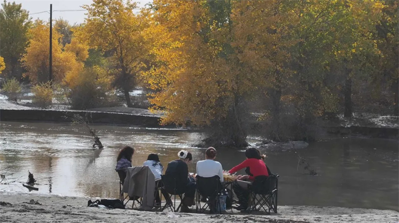 10月19日,在阿瓦提县刀郎沙漠胡杨营地,高大的胡杨或挺拔如卫士直立,或虬曲似老者蜿蜒,金黄的叶片在秋日阳光下闪烁着碎金般的光泽。游客们放慢脚步,有的举起手机、相机,将胡杨盛景与自己的身影定格;还有人在林间空地铺开餐布,摆上美食,在金黄胡杨的环抱中享受惬意野餐时光。