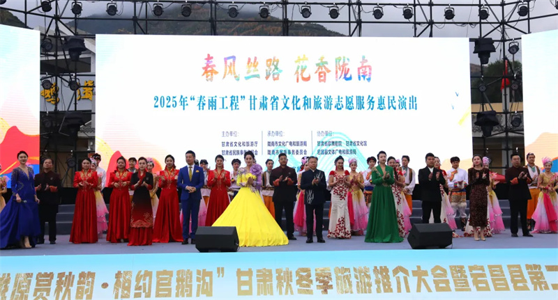 推介大会后,由省文旅厅、省民委主办,省歌舞剧院、省文化馆协办的“春风丝路·花香陇南”2025年“春雨工程”甘肃省文化和旅游志愿服务惠民演出精彩上演,促进优质文化资源直达基层,增强群众文化获得感与幸福感。演出期间还开展了“文化艺术辅导微课堂”,由全省文艺志愿者对基层文艺骨干进行书画等艺术普及和笔友交流活动,助力新时代文明实践。