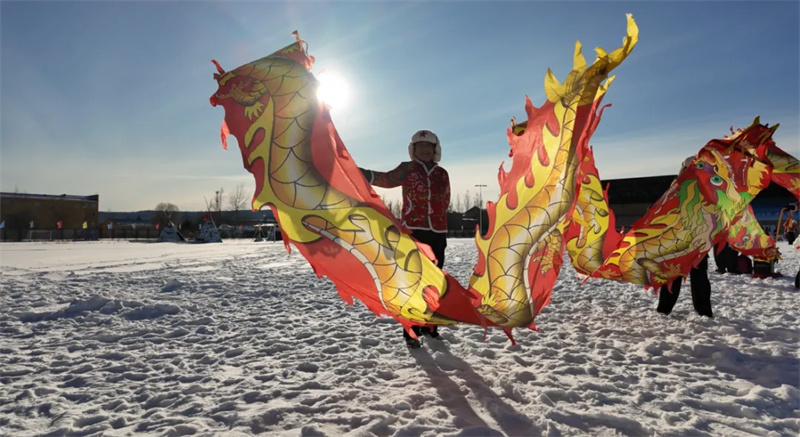 活动现场,文旅局群众文化负责人率先舞动健身龙,彩龙在雪地上空翻飞起舞,划破冬日长空。紧随其后,广场舞爱好者们踏着欢快的节拍,在银装素裹的天地间尽情舞动,跃动的身影与洁白的雪地构成一幅生机勃勃的冬日画卷。