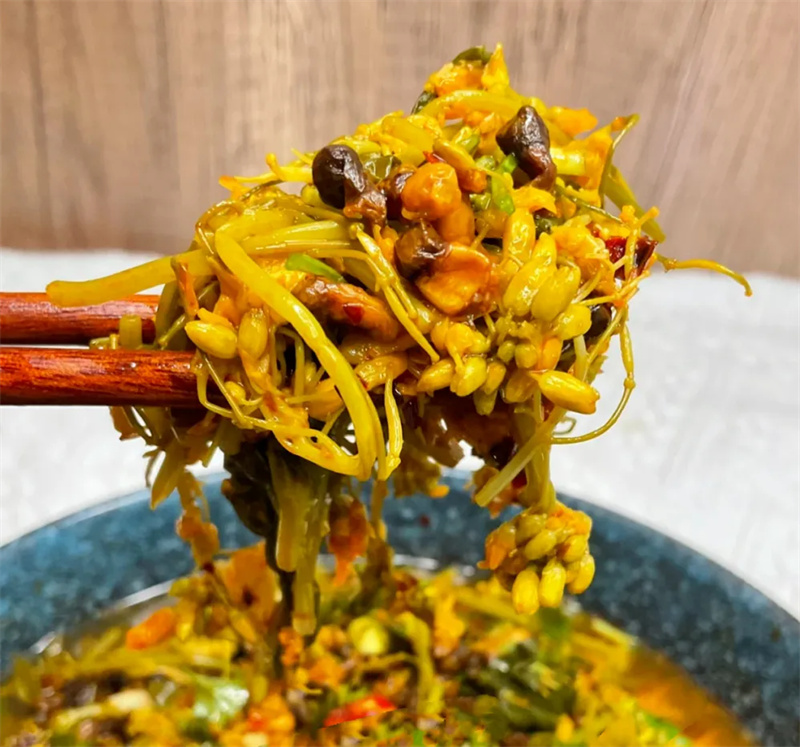 2013年公布为昌宁县非物质文化遗产代表性项目,菜花腌菜吃法多样,最为美妙爽口的则首推“水腌菜拌蜂蛹”。蜂蛹的肥嫩甘鲜、水腌菜的酸甜馨香,着实诱人食欲。如今,这道地地道道的乡间野蔬已成为一方风味名吃,备受四方食客称赏。