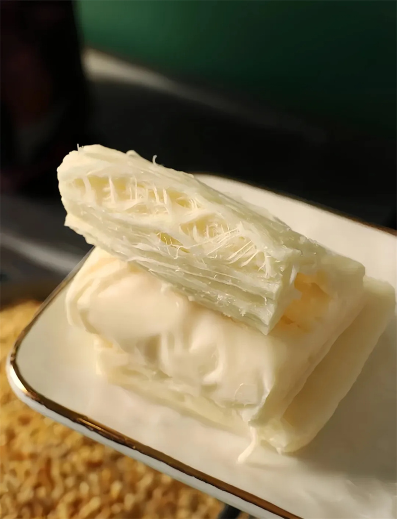 我是一块会“跳舞”的手撕奶酪!在工厂里,我从一滴纯净的鲜奶开始了奇妙旅程。自然发酵赋予我活泼的个性,工匠们用手温柔地将我分离、熬煮。当我的乳酪蛋白在指尖缠绕舒展,便拥有了拉丝的魔法——能拉多长?全凭你手心的温度!告别工业流水线,我坚持用古法沉淀风味:过滤、定型、慢慢成熟…...每一步都是为了让撕开的瞬间,散发出天然的乳香与韧劲。我的使命,就是成为你零食盒里的快乐源泉——撕开时感受韧性的抵抗,咀嚼中体验奶香的回弹。无论是空口解馋还是配酒小酌,我都能满足你对天然奶酪的所有想象!