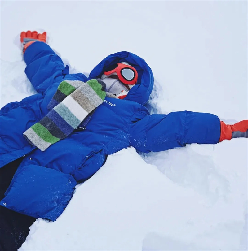孩子穿搭以保暖为主,搭配防水防滑的雪地靴、手套、护脸、帽子,做好全面保暖;
