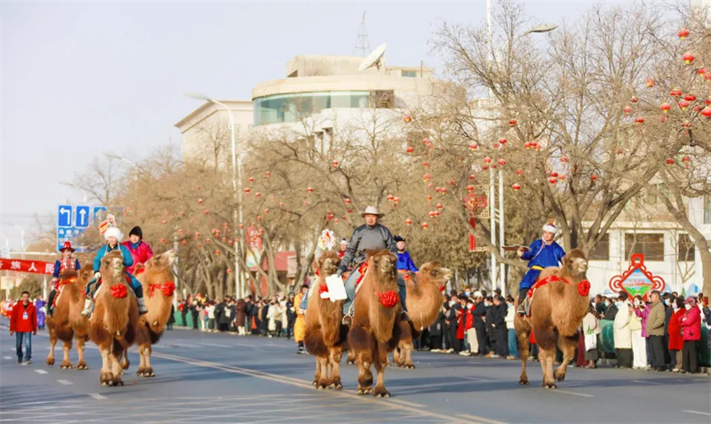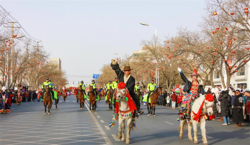 上午9时许,震天的锣鼓声拉开了社火巡演的序幕。各代表队列阵以待,气势恢宏:金色长龙蜿蜒翻腾、气势磅礴;雄狮腾挪跳跃、惟妙惟肖;马队与骆驼队整齐行进,气宇轩昂。随后,花伞、腰鼓、藏戏等方阵轮番登场,演员们身着艳丽服饰,踏着欢快鼓点,将新春的喜悦传递给在场观众。沿途市民纷纷驻足喝彩,街巷间洋溢着团圆祥和的温情。