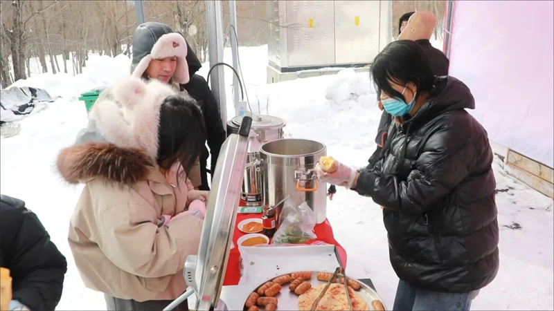 活动还设置了“林海雪原”民俗体验市集,精美的非遗桦树皮画、林俗手工艺品吸引着游客驻足欣赏;冻梨、糖葫芦等北方特色小吃的摊位前更是排起了长队。不仅让游客体验了地道的林区风情,更将一份份“可以带走的记忆”传递到四面八方。现场还支起热气腾腾的大锅,为大家送上汤圆,让浓郁的文化气息与温暖的“年味儿”在冰天雪地中蒸腾。
