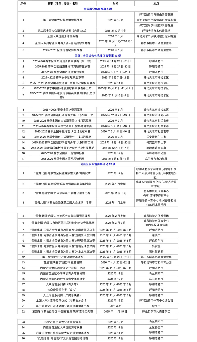 为进一步打造内蒙古体育赛事品牌,着力扩大文体旅商消费,加快推进体育赛事经济高质量发展,更好满足人民群众多元化精神文化和旅游需求,近日,内蒙古自治区体育局、文化和旅游厅、商务厅联合发布2025-2026年全区大众冰雪季重点赛事活动目录。其中,第二届全国大众越野滑雪挑战赛等全国群众体育赛事5项,2025-2026赛季全国短道速滑精英联赛等国际、全国综合性竞技体育赛事17项,“雪舞北疆·内蒙古全民健身冰雪大赛”开赛仪式等自治区级冰雪赛事活动26项,共48项重点赛事。