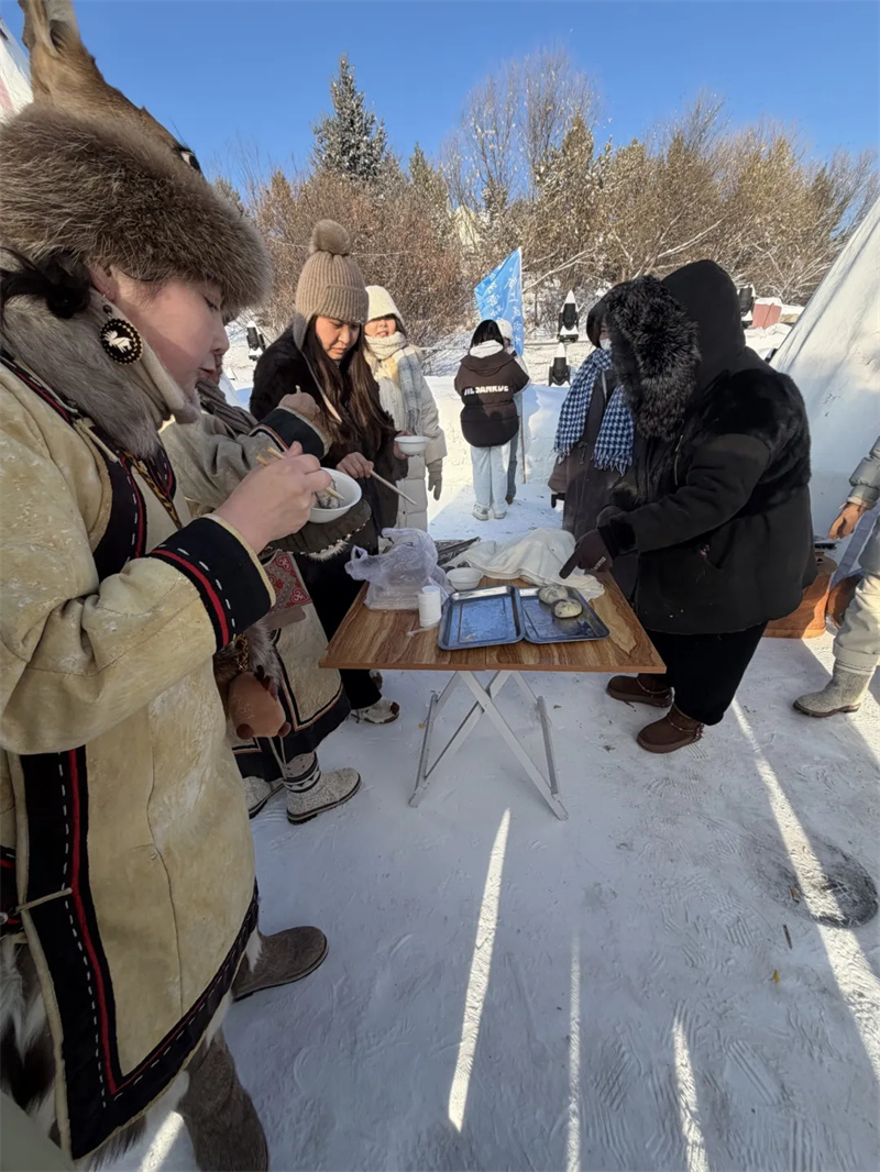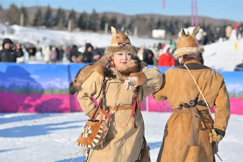 “做一天鄂伦春人”项目中,来宾与游客在斜仁柱中苏醒,学习搭建技艺、缝制皮毛服饰、制作手把肉等传统美食,围着篝火学唱“赞达仁”、跳起“斗熊舞”,沉浸式体验游猎生活;“穿越林海雪原”让大家在鄂伦春族向导带领下,循着传统狩猎路线前行,探访嘎仙洞等遗迹,感受自然与历史的双重震撼;“集趣雪营地”内,文创集装箱、特色小吃车、帐篷营地各具特色,雪地摩托、冰上娱乐、围炉煮茶、网红打卡等项目应有尽有,满足了不同群体的游玩需求。此外,鄂伦春箭王争霸赛、速滑比赛、青少年本布利足球决赛等多项体育赛事同步举办,为冰雪季增添了竞技活力。