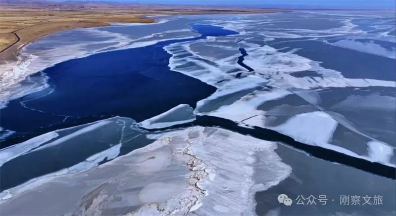 开湖是一种刚柔并济的自然大美。在刚察,世代相传着“文开”与“武开”的传奇,一动一静,皆为天地造化。文开,是含蓄温婉的苏醒。冰层在春风暖阳中慢慢酥融,于无声无息间碧波重现。半湖残冰若碎玉轻浮,半湖春水漾着微光,冰水相依、蓝白相映,如一首无言的诗,在高原大地缓缓铺展,让人在辽阔圣境中感受极致的治愈与安宁。