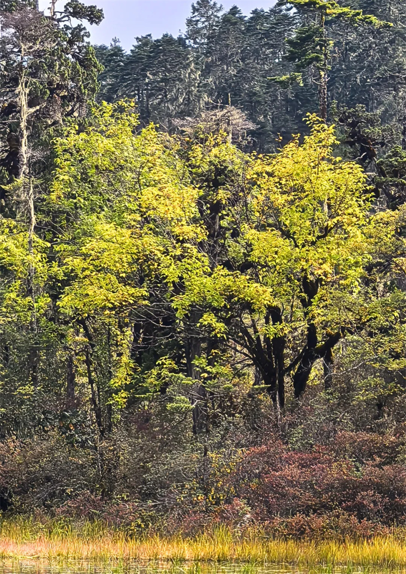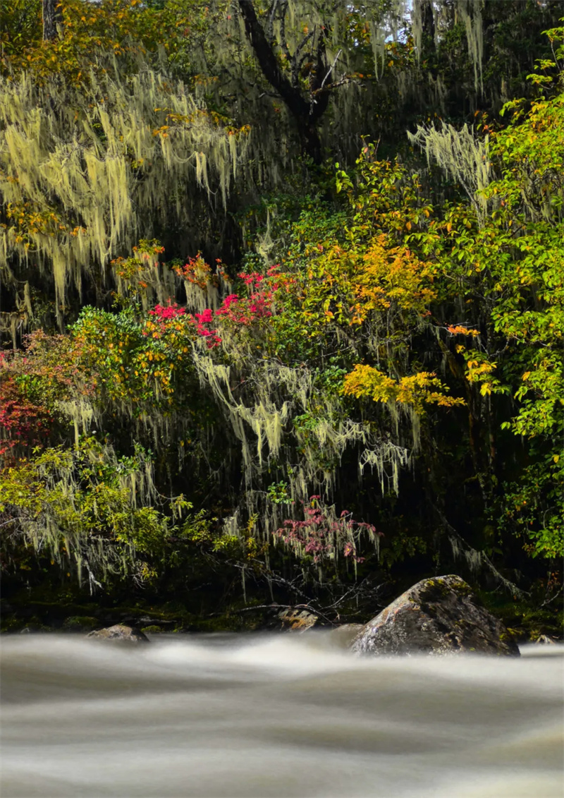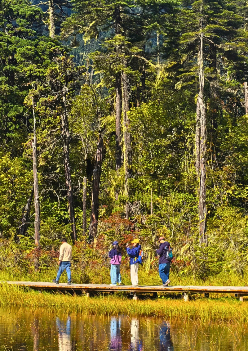 随着秋色渐浓,翠绿幽深的原始森林逐渐披上了更为惊艳的颜色,置身其中,仿佛闯入了浓墨重彩的油画中。