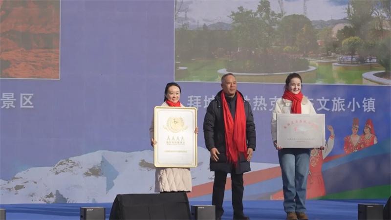 在授牌仪式环节,新疆维吾尔自治区文化和旅游厅财务处二级调研员郭江权为阿瓦提县塔木托格拉克镇吐格贝希村授予“自治区级乡村旅游重点村”牌匾;地委书记吴红展分别为拜城县克孜尔红石林景区(国家4A级旅游景区)和铁热克生态文旅小镇(自治区康养旅游基地)授牌。
