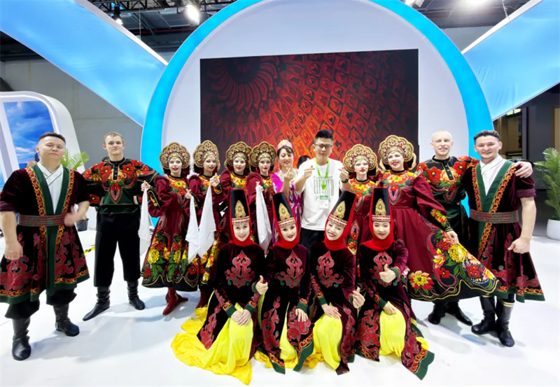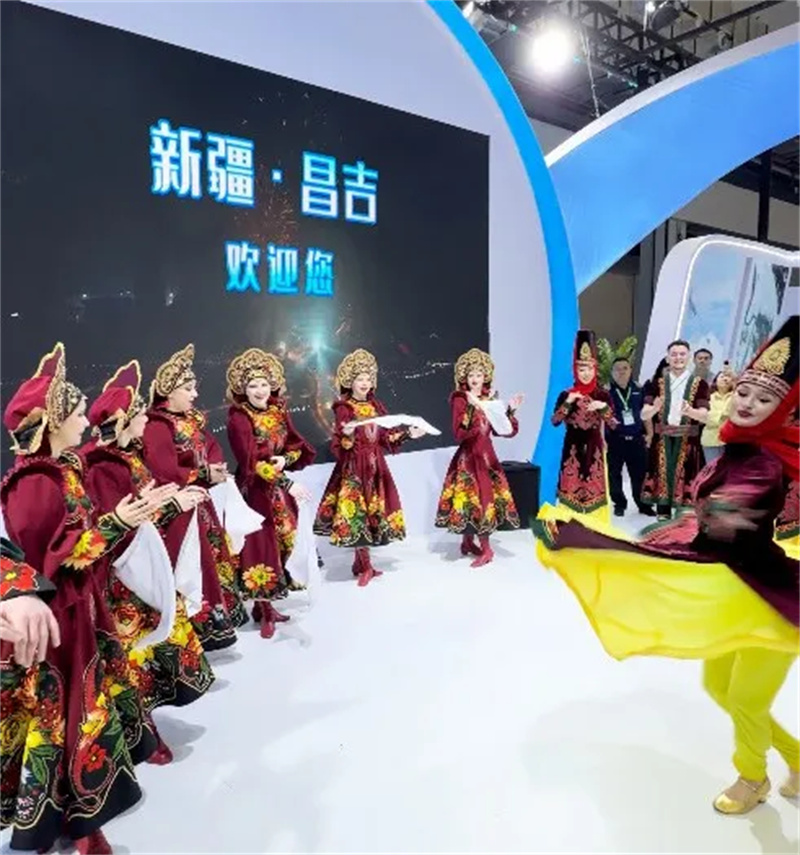 展位现场最动人的一幕当属昌吉州歌舞与俄罗斯歌舞的即兴联动,让丝路风情与异域韵律碰撞出跨国界的艺术火花。昌吉舞者踏着《黑走马》的欢快节拍旋舞,俄罗斯舞者轻盈的踢踏、飞扬的裙摆洋溢着东欧热情,现场观众自发打起节拍,掌声与欢呼声响彻全场。艺术成为跨越国界的通用语言,也为这场文旅推介增添了深厚的友谊色彩。
