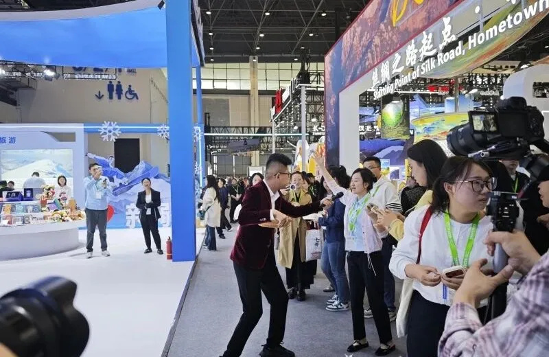 本届旅交会上,新疆展位人气持续高涨,而昌吉州无疑是其中最亮眼的“流量担当”。展区内,每天都有精彩的昌吉歌舞轮番上演,现场还设置了丰富的互动体验环节,如有奖互动问答、特色美食品尝、非遗手工艺品展示等,还有工作人员耐心讲解昌吉州的旅游线路和优惠政策,邀请观众参与问答互动并赠送精美文创礼品。
