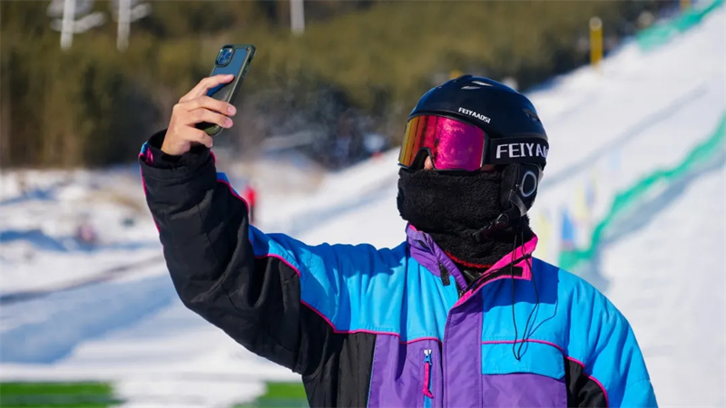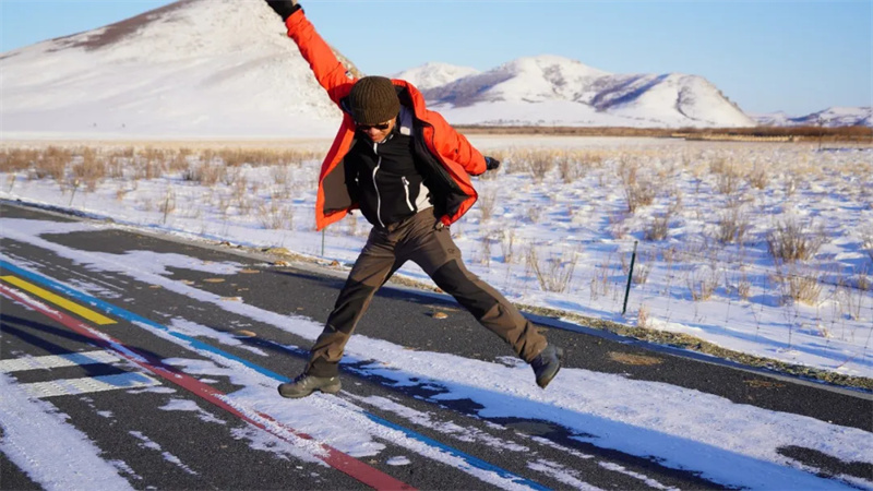 当日10时30分,游客团抵达“草原99号公路”起点。冬日的公路两侧,草原被皑皑白雪全覆盖,远山勾勒出银白轮廓,阳光洒在雪面折射出璀璨光芒,与泰国常年翠绿的热带风光形成鲜明对比,引得游客纷纷驻足拍照留念。泰国游客一边用相机记录美景。