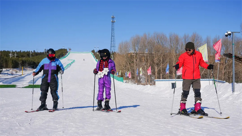 随后,游客团前往西乌旗滑雪场,在专业教练的指导下换上装备、踏上雪道。多数游客为首次接触滑雪,虽因重心不稳多次摔倒,但雪场上欢声笑语不断,大家相互鼓励、反复练习,不少人快速掌握基础技巧,在初级雪道上顺利滑行,充分感受冰雪运动的独特乐趣。在“冰雪集结号越野穿越体验”中,游客乘坐专业越野车穿梭于积雪草原与林间,车辆颠簸前行溅起阵阵雪雾,刺激的穿越体验引发游客阵阵惊呼。导游沿途讲解西乌旗冬季草原生态特色与游牧文化,让旅程兼具娱乐性与知识性。