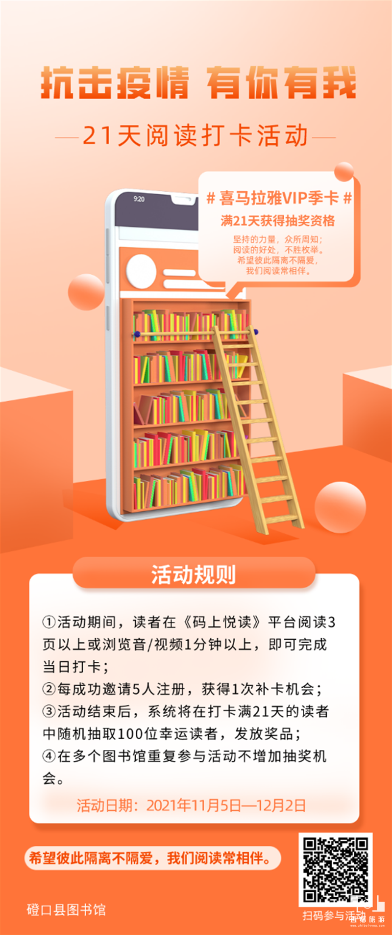 “抗击疫情,有你有我”21 天阅读打卡活动,于 2021 年 11 月 5 日开始,12 月 2 日截止,目的是通过 21 天连续打卡养成阅读习惯, 激励广大读者踊跃读书,提升文化素养。阅读可以陶冶情操、丰富学识,不论是在工作还是生活中,对我们都大有裨益。同时我们也为广大读者准备了精美的礼品,希望大家积极参与!