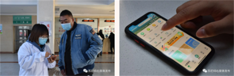 来到旗人民医院,记者看到,为了减少患者排队挂号的等候时间,工作人员现场教授患者如何使用蒙速办APP进行预约登记挂号.