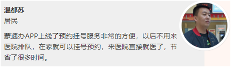 不仅是蒙医院、旗医院预约登记挂号服务接入蒙速办APP,旗交通局将公交查询功能、鑫刚热力的缴费功能也都接入“蒙速办”,持续不断完善网上办等服务,真正实现让“数据多跑腿,群众少跑腿”,切实为企业、群众提供优质、高效、便捷的公共服务。
