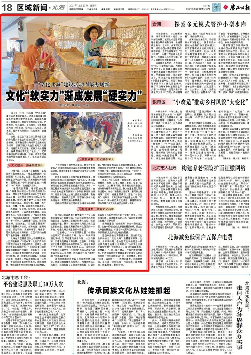 12月7—12日,2021年“文化北海”建设活动周成功举办,这是北海连续3年举办的年度大型文化活动。当前,全区上下正在深入贯彻落实党的十九届六中全会和自治区第十二次党代会精神,北海通过活动周将学习成果转化为行动,以强烈的文化自觉推动文化建设,取得明显成效。持续增强文化的“软实力”渐成北海发展的“硬实力”。