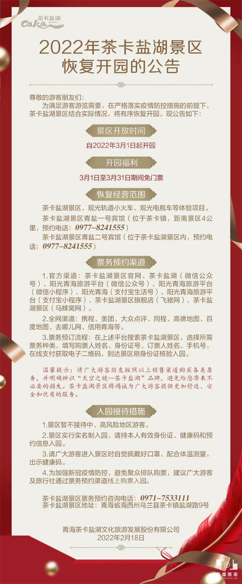 茶卡盐湖景区于3月1日至3月31日期间免门票,恢复观光轨道小火车、观光电瓶车等体验项目。