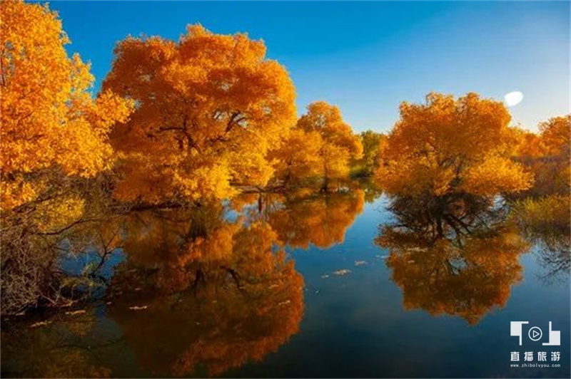 秋日的额济纳,蓝天碧水、金色胡杨、弱水流沙、如霞红柳构成了一幅天然的油画。