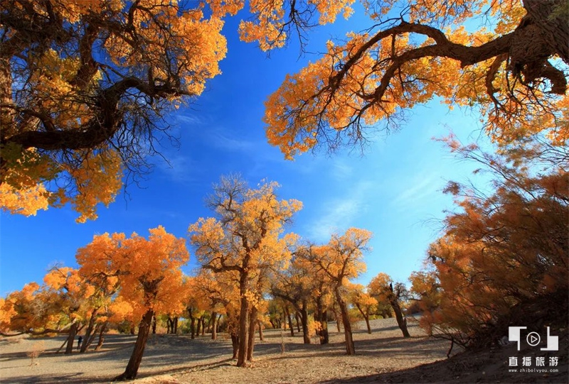 从西边的额济纳旗到东边的科尔沁右翼中旗距离约2200公里,穿过城市和村庄,越过草原和丘陵,秋风拂过四千里,黄了胡杨,红了枫叶。今年国庆节期间,新浪内蒙古推出的《当胡杨林遇上五角枫》直播活动,将镜头对准了秋日艳阳下金灿灿的胡杨林和火红的五角枫。